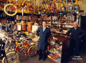 Owner Bill Hollingsworth (left) and his assistant in their Meadows of Cheadle bicycle shop on south side of Gatley Road, close to the junction with Wilmslow Road