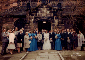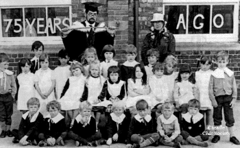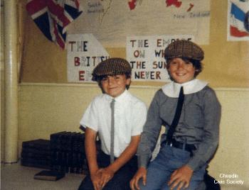 As part of the 75th anniversary celebrations in 1984, the headmaster Mr Marshall and pupils at Cheadle Primary School wear period costumes to re-enact how life may have been at the school when it was opened in 1909