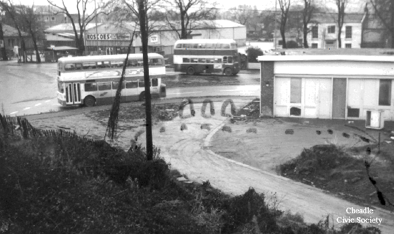 Buses on Roscoe's Roundabout in 1973 with the old Roscoe's DIY store in the background