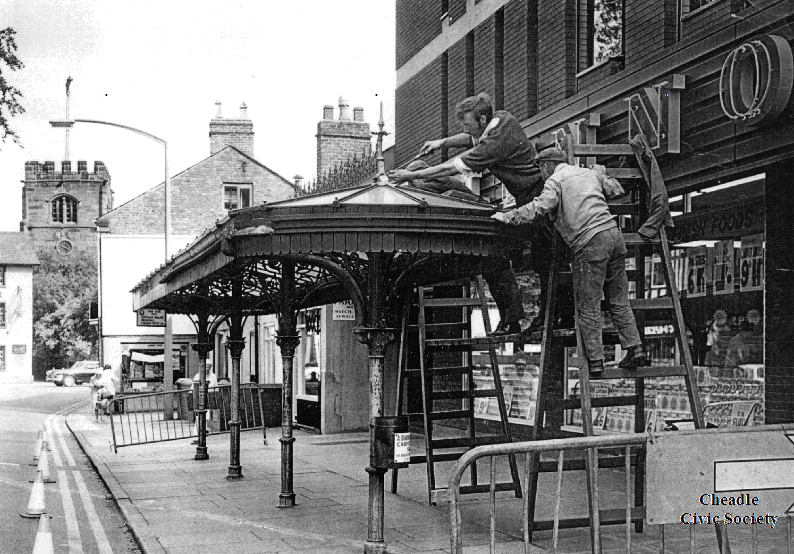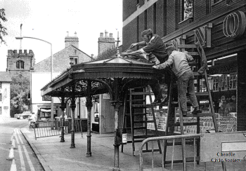 Repairing the bus shelter on Wilmslow Road outside Lennons supermarket. The bus shelter has now bene replaced, with the original relocated to Heaton Park in North Manchester.