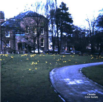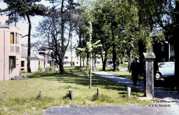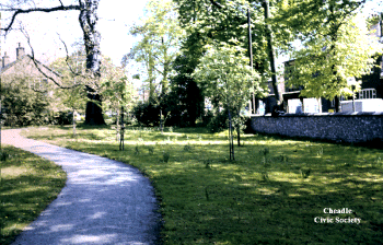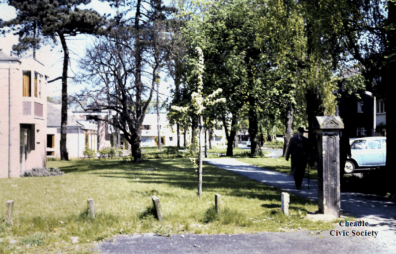 Footpath leading to Queens Gardens from the back of Cheadle Green with the original gatepost from the now demolished Cheadle Hall still standing