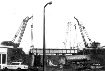 Construction of the new railway bridge over Stockport Road, close to Roscoe's Roundabout
