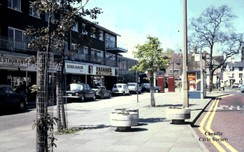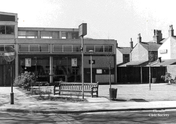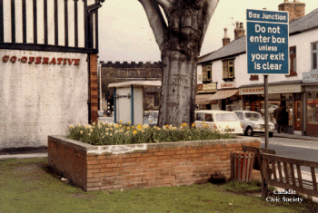 Large concrete flower pots in front of the British Telecom showroom/exchange on the south side of High Street
