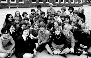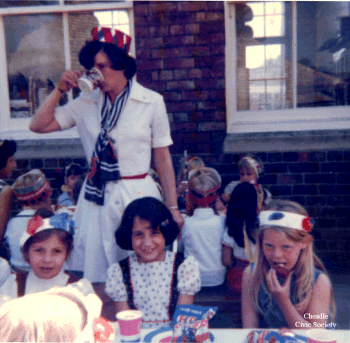 School teacher and children at Cheadle Primary School enjoy a party to celebrate Queen Elizabeth's Silver Jubilee in 1977