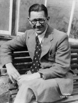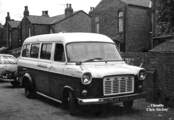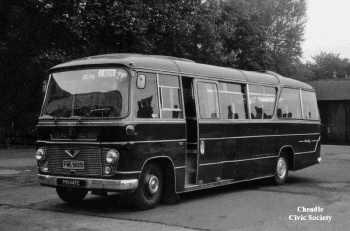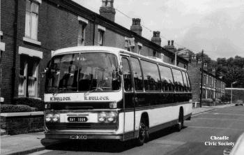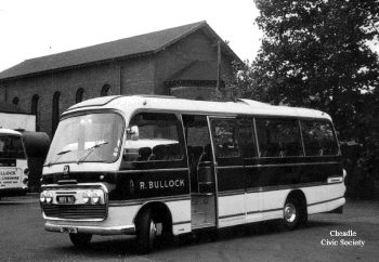 A Bullocks coach in its yard on the north side of Stockport Road, with St Chad's church in the background