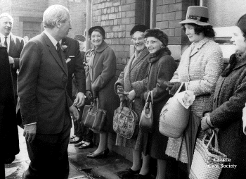 Former Prime Minister and leader of the Conservative party Edward Heath talks with local supporters outside the Cheadle Conservative Club on Stockport Road
