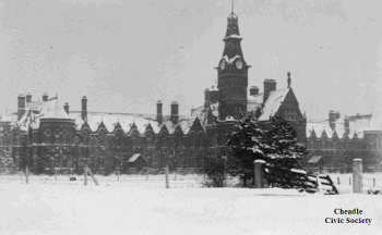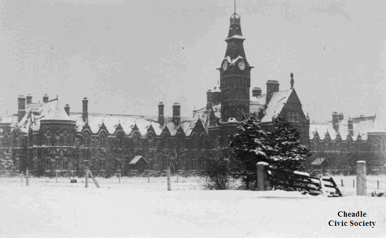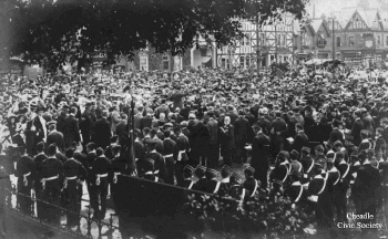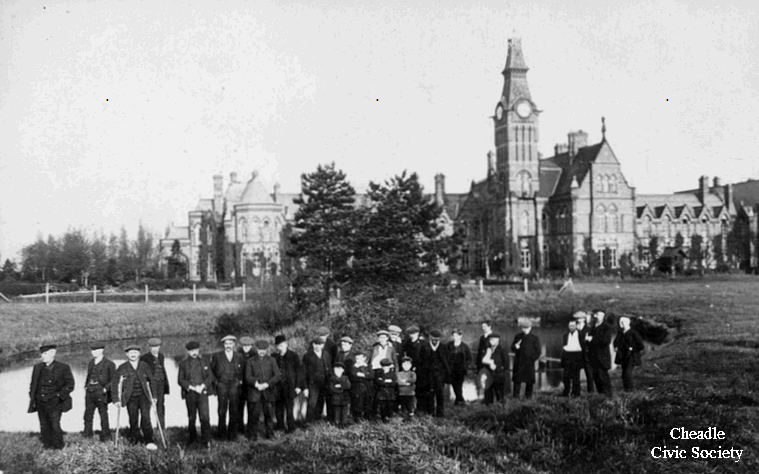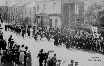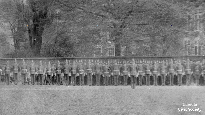 Soldiers assemble in full uniform on Cheadle Green during World War 1. Cheadle Hall is behind