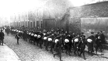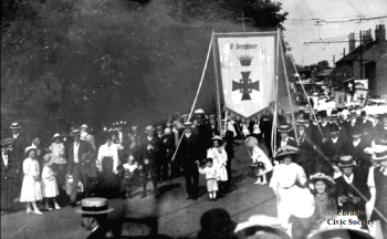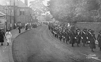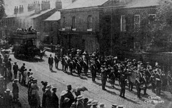 A band marches along High Street, possibly during World War 1, with large crowds on the pavement